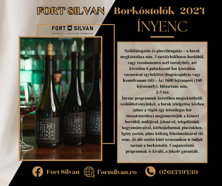 Szőlőlátogatás és pincelátogatás – a borok megkóstolása min. 3 tartályból(boros hordóból, vagy rozsdamentes acél tartályból), azt követően 6 palackozott bor kóstolása vacsorával egybekötve (bográcsgulyás vagy Kemsilvanum tál) – Ár: 1600 lej/csoport (160 lej/személy). Időtartam: min.